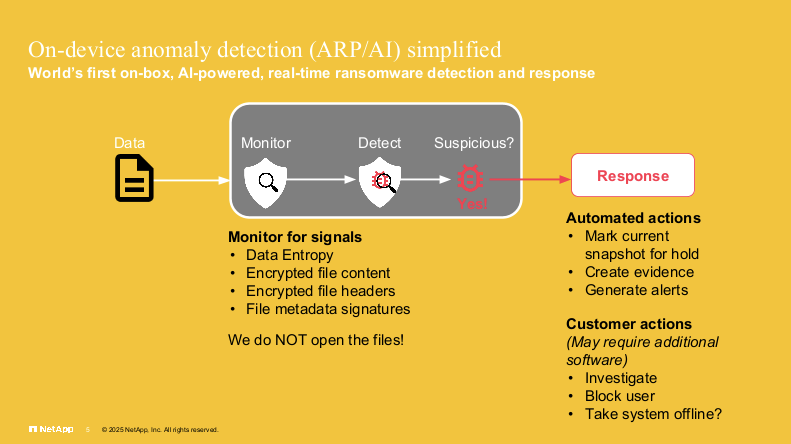 - Udoskonalone algorytmy AI: Silnik AI do wykrywania ransomware jest teraz jeszcze bardziej zaawansowany. Działa szybciej, minimalizuje fałszywe alarmy (false positives), a co najważniejsze – jego aktualizacja odbywa się niezależnie od aktualizacji systemu ONTAP. Dzięki temu ochrona jest zawsze na bieżąco, bez konieczności pełnego upgrade’u.
