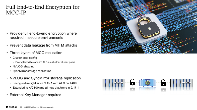 - Trzy warstwy replikacji MCC – NVLOG, SyncMirror i standard TLS między peerami klastra.